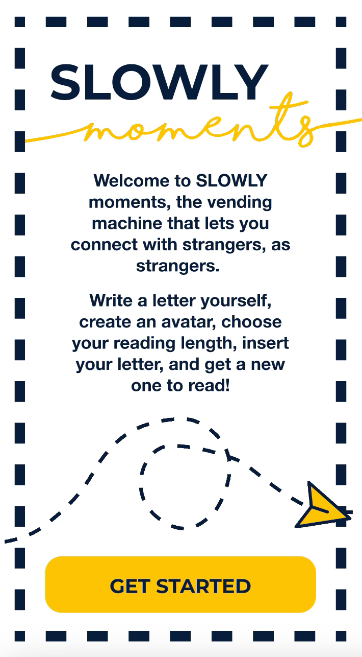 SLOWLY is an online pen-pal app designed to match up people with similar interests with ease. My vending machine takes this idea into public with real paper and real pencils, but staying completely anonymous. Placed inside airports, patrons can write anonymous letters to others, and receive one in return.